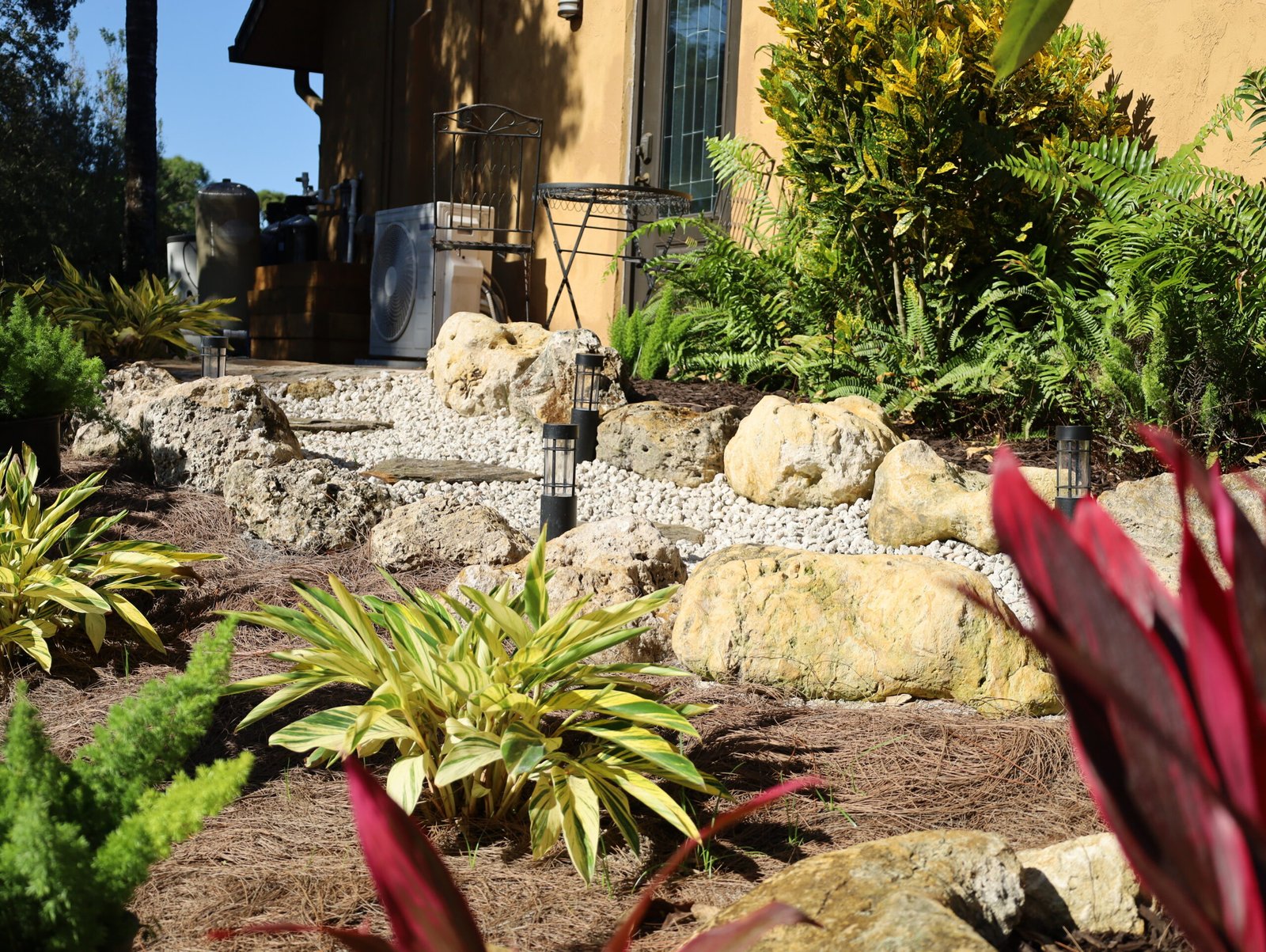Our team turned this backyard into a private tropical retreat with a custom garden installation. Featuring Chinese Fan Palms, Fox Tail Ferns, Croton Magnificent, and Ti Red Sister plants, this design adds vibrant color, texture, and year-round greenery. Finished with rich black mulch, this tropical landscape brings a lush, resort-style feel to the homeowner’s outdoor space.